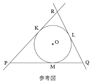 (2) 点Oを中心とする半径6の円Oが、線分PQ上のP,Qと異なる点Mにおいて線分PQに接している。P,Qそれぞれを通る円Oの接線で、直線PQと異なるものを引き、この円との接点をそれぞれK,Lとする。以下では直線PK,QLが交わる場合を考え、その交点をRとする。このとき、△PQRの辺の長さについて考えよう。