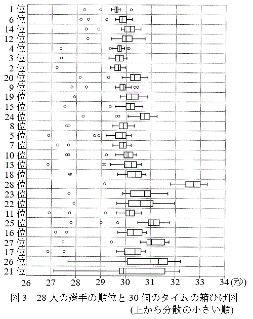 (秒)である。そして、公式順位(以下、順位)は、タイムの値が小さい方が上位となる。また、28人の選手それぞれのタイムについて、スタートから750mまでのタイムを