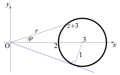 です。 原点から円Eに接線を引くと、右図より接線と実軸正方向のなす角の正弦は