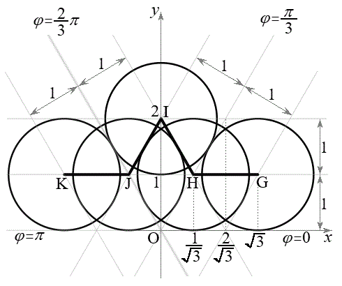 が右図太線上に位置するとき、円Fはいずれかの動径と接していてかつ他の動径と共有点を持っているので、中心
