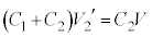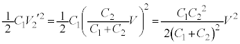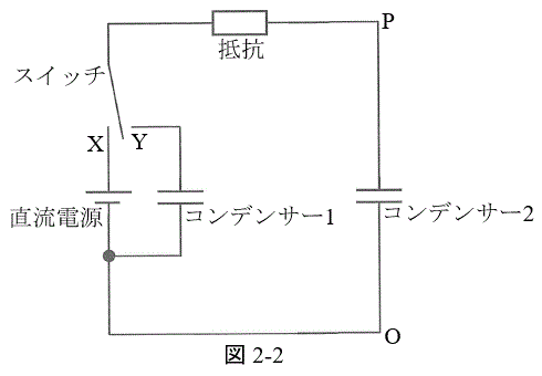 (2) スイッチを X に入れて充分時間が経過した後、コンデンサー 2 の電荷は スイッチを Y に切り替えて充分時間が経過すると、 と が 並列 になるので、両端の電圧を として、 , コンデンサー 1 に蓄えられるエネルギーは、 ......[ 答 ]