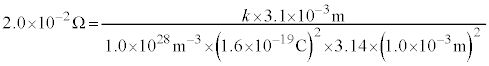,ただしeは電気素量)が抵抗器の中を運動し電流が流れる。自由電子の運動については以下の仮定をおく。(i)円柱の中心軸に平行な方向にのみ動く。(ii)自由電子の受ける力は、電池が抵抗器中に作る電場による力と、抵抗器中の陽イオンなどによる抵抗力の2種類のみである。(iii)抵抗力の向きは自由電子の速度と逆方向である。一個の自由電子に対する抵抗力の大きさは自由電子の速さに比例し、正の比例定数kを用いてk×(自由電子の速さ)で与えられる。(iv)導線の抵抗は考えなくてよい。