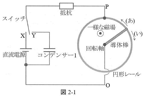 (2) その後、導体棒が回転軸の周りを回転し始めた。図 2-1 の ( あ ) , ( い ) のどちら向きに回転したか答えよ。